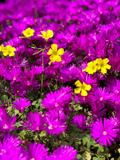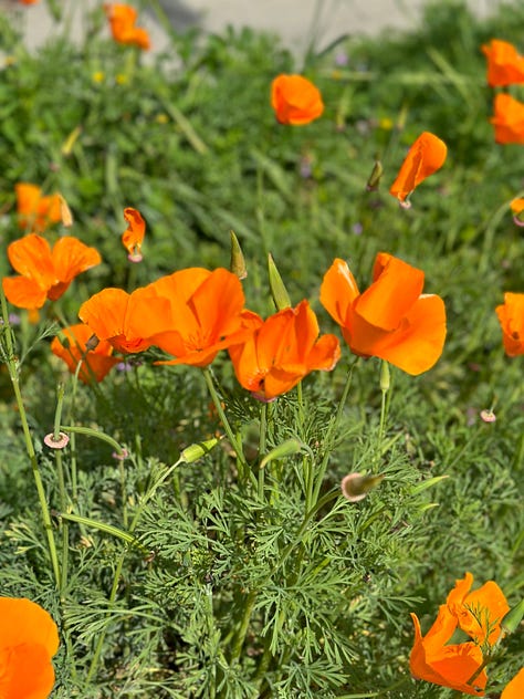 All the water has made California blissfully green. The wildflowers are popping up everywhere—so much so that I’ve been hunting them. I’ve been eating some of the sweetest fruits recently that remind me sensorily of vine ripe Georgia tomatoes. All the images are crossing wires from formative home to chosen home, and I’m relaxing into some hard won waking theta waves (so says my therapist) after an extreme work push, and poetry is popping up in my life like these wildflowers I’ve been hunting.